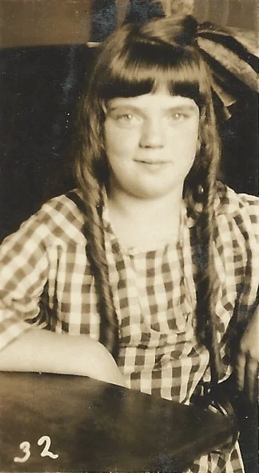 Our Sunday "go to church" family on the farm. Back row, l-r; Aunt Katherine, Uncle Gus, Grandma Louise, Dad George, Mom Muriel. Front row, l-r; Janet, me. On the left, dog Trixie.